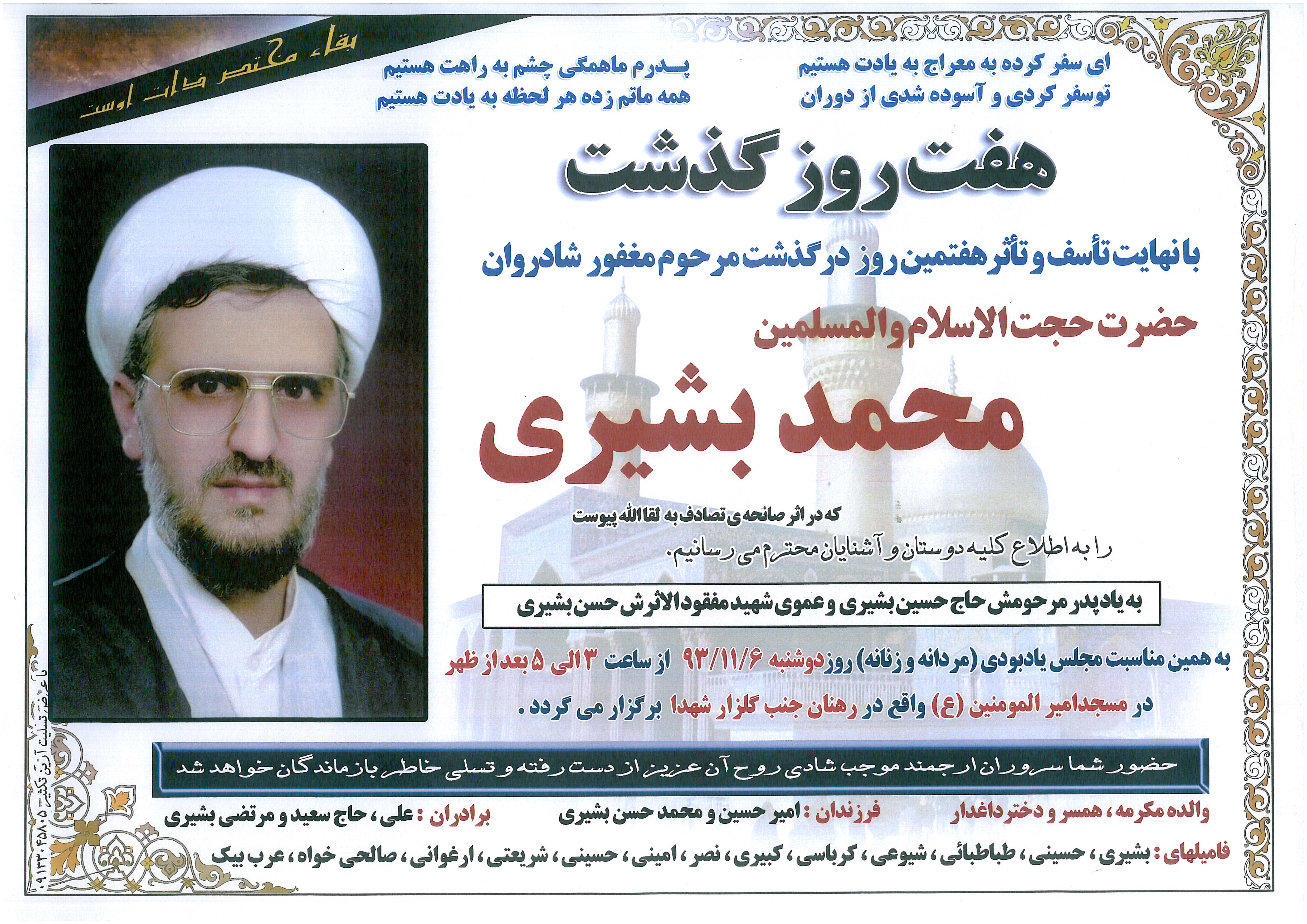 به خاطر دارم در اردیبهشت ماه سال ۶۷ که فاو سقوط کرد ما با مرحوم بشیری در حلبچه بودیم که خبر رسید اخوی ایشان به اسارت درآمده و تصویرش در تلوزیون عراق نشان داده شده است . ایشان به اصفهان رفت و شخصا خبر اسارت را به مادر محترمه اشان داد و بی فوت وقت به جبهه بازگشت . خوش زیست و خوش رفت .